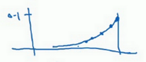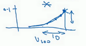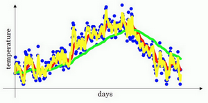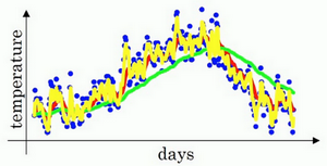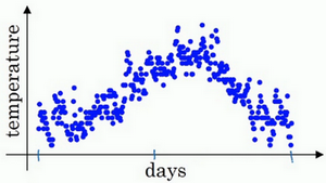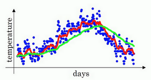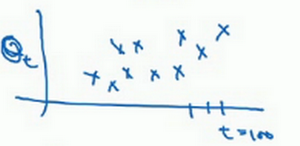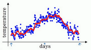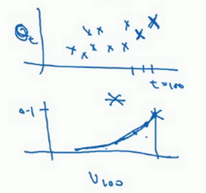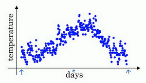 所以这是一个加和并平均,100 号数据,也就是当日温度。我们分析$v_{100}$ 组成,也就是在一年第 100 天计算的数据,但是这个是总和,包括 100 号数据,99 号数据,97 号数据等等。画图的一个办法是,假设我们有一些日期的温度,所以这是数据,这是$t$,所以 100 号数据有个数值,99 号数据有个数值,98 号数据等等,$t$ 100,99,98 等等,这就是数日的温度数值。