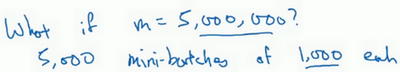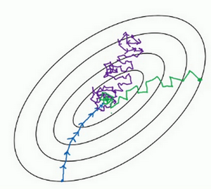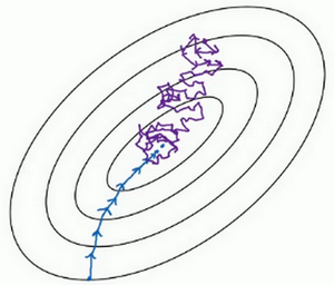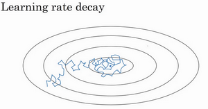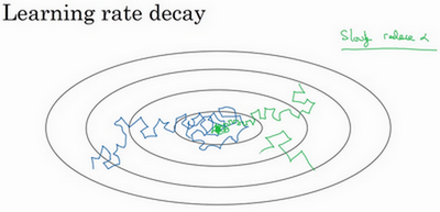 假设你要使用mini-batch梯度下降法,mini-batch数量不大,大概 64 或者 128 个样本,在迭代过程中会有噪音(蓝色线),下降朝向这里的最小值,但是不会精确地收敛,所以你的算法最后在附近摆动,并不会真正收敛,因为你用的$a$ 固定值,不同的mini-batch中有噪音。