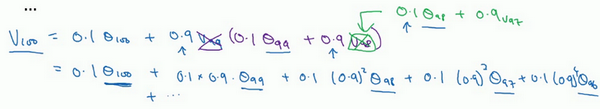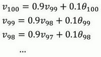$v_{100} = 0.1\theta_{100} + 0.1 \times 0.9 \theta_{99} + 0.1 \times {(0.9)}^{2}\theta_{98} + 0.1 \times {(0.9)}^{3}\theta_{97} + 0.1 \times {(0.9)}^{4}\theta_{96} + \ldots$