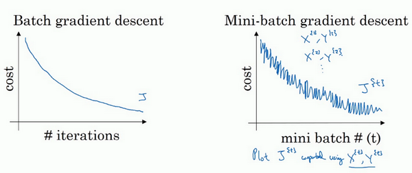 例如,如果你要优化成本函数,函数形状如图,红点代表最小值的位置,假设你从这里(蓝色点)开始梯度下降法,如果进行梯度下降法的一次迭代,无论是batch或mini-batch下降法,也许会指向这里,现在在椭圆的另一边,计算下一步梯度下降,结果或许如此,然后再计算一步,再一步,计算下去,你会发现梯度下降法要很多计算步骤对吧?