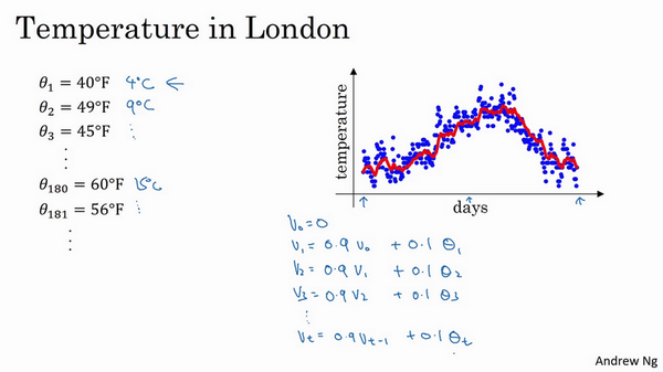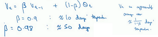 再说一次,但是换个说法,$v_{\theta} =0$,然后每一天,拿到第$t$ 的数据,把$v$ 新为$v: = \beta v_{\theta} + (1 -\beta)\theta_{t}$。