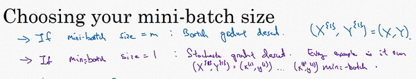 你应该拆分成不同的mini-batch,第一次遍历训练集叫做第一代。第二次就是第二代,依此类推,你可以将$a$ 习率设为$a= \frac{1}{1 + decayrate * \text{epoch}\text{-num}}a_{0}$(decay-rate称为衰减率,epoch-num为代数,$\alpha_{0}$ 初始学习率),注意这个衰减率是另一个你需要调整的超参数。