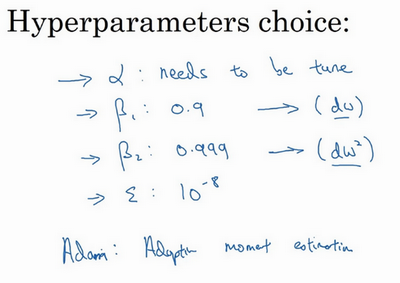 本算法中有很多超参数,超参数学习率$a$ 重要,也经常需要调试,你可以尝试一系列值,然后看哪个有效。$\beta_{1}$ 用的缺省值为 0.9,这是 dW 的移动平均数,也就是$dW$ 加权平均数,这是Momentum涉及的项。至于超参数$\beta_{2}$,Adam论文作者,也就是Adam算法的发明者,推荐使用 0.999,这是在计算${(dW)}^{2}$ 及${(db)}^{2}$ 移动加权平均值,关于$\varepsilon$ 选择其实没那么重要,Adam论文的作者建议$\varepsilon$ $10^{-8}$,但你并不需要设置它,因为它并不会影响算法表现。但是在使用Adam的时候,人们往往使用缺省值即可,$\beta_{1}$,$\beta_{2}$ $\varepsilon$ 是如此,我觉得没人会去调整$\varepsilon$,然后尝试不同的$a$ ,看看哪个效果最好。你也可以调整$\beta_{1}$ $\beta_{2}$,但我认识的业内人士很少这么干。