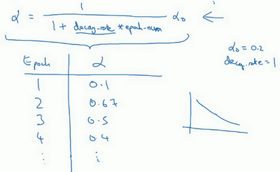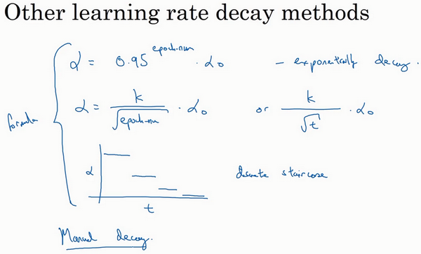 人们用到的其它公式有$a =\frac{k}{\sqrt{\text{epoch-num}}}a_{0}$ 者$a =\frac{k}{\sqrt{t}}a_{0}$($t$ mini-batch的数字)。