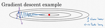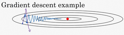 回忆一下我们之前的例子,如果你执行梯度下降,虽然横轴方向正在推进,但纵轴方向会有大幅度摆动,为了分析这个例子,假设纵轴代表参数$b$,横轴代表参数$W$,可能有$W_{1}$,$W_{2}$ 者其它重要的参数,为了便于理解,被称为$b$ $W$。