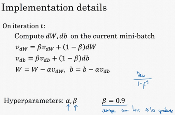所以你有两个超参数,学习率$a$ 及参数$\beta$,$\beta$ 制着指数加权平均数。$\beta$ 常用的值是 0.9,我们之前平均了过去十天的温度,所以现在平均了前十次迭代的梯度。实际上$\beta$ 0.9 时,效果不错,你可以尝试不同的值,可以做一些超参数的研究,不过 0.9 是很棒的鲁棒数。那么关于偏差修正,所以你要拿$v_{dW}$ $v_{db}$ 以$1-\beta^{t}$,实际上人们不这么做,因为 10 次迭代之后,因为你的移动平均已经过了初始阶段。实际中,在使用梯度下降法或动量梯度下降法时,人们不会受到偏差修正的困扰。当然$v_{{dW}}$ 始值是 0,要注意到这是和$dW$ 有相同维数的零矩阵,也就是跟$W$ 有相同的维数,$v_{db}$ 初始值也是向量零,所以和$db$ 有相同的维数,也就是和$b$ 同一维数。