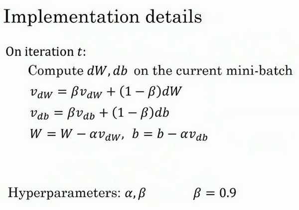 最后要说一点,如果你查阅了动量梯度下降法相关资料,你经常会看到一个被删除了的专业词汇,$1-\beta$ 删除了,最后得到的是$v_{dW}= \beta v_{{dW}} +dW$。用紫色版本的结果就是,所以$v_{{dW}}$ 小了$1-\beta$ ,相当于乘以$\frac{1}{1- \beta}$,所以你要用梯度下降最新值的话,$a$ 根据$\frac{1}{1 -\beta}$ 应变化。实际上,二者效果都不错,只会影响到学习率$a$ 最佳值。我觉得这个公式用起来没有那么自然,因为有一个影响,如果你最后要调整超参数$\beta$,就会影响到$v_{{dW}}$ $v_{db}$,你也许还要修改学习率$a$,所以我更喜欢左边的公式,而不是删去了$1-\beta$ 这个公式,所以我更倾向于使用左边的公式,也就是有$1-\beta$ 这个公式,但是两个公式都将$\beta$ 置为 0.9,是超参数的常见选择,只是在这两个公式中,学习率$a$ 调整会有所不同。