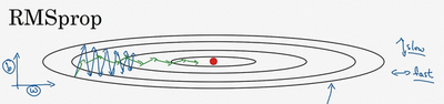 RMSprop的影响就是你的更新最后会变成这样(绿色线),纵轴方向上摆动较小,而横轴方向继续推进。还有个影响就是,你可以用一个更大学习率$a$,然后加快学习,而无须在纵轴上垂直方向偏离。