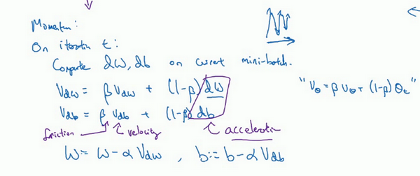 想象你有一个碗,你拿一个球,微分项给了这个球一个加速度,此时球正向山下滚,球因为加速度越滚越快,而因为$\beta$ 稍小于 1,表现出一些摩擦力,所以球不会无限加速下去,所以不像梯度下降法,每一步都独立于之前的步骤,你的球可以向下滚,获得动量,可以从碗向下加速获得动量。我发现这个球从碗滚下的比喻,物理能力强的人接受得比较好,但不是所有人都能接受,如果球从碗中滚下这个比喻,你理解不了,别担心。