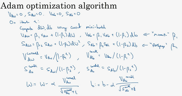 最后更新权重,所以$W$ 新后是$W:= W - \frac{a v_{dW}^{\text{corrected}}}{\sqrt{S_{dW}^{\text{corrected}}} +\varepsilon}$(如果你只是用Momentum,使用$v_{dW}$ 者修正后的$v_{dW}$,但现在我们加入了RMSprop的部分,所以我们要除以修正后$S_{dW}$ 平方根加上$\varepsilon$)。