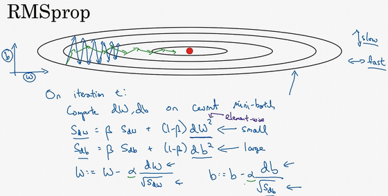 接着RMSprop会这样更新参数值,$W:= W -a\frac{dW}{\sqrt{S_{dW}}}$,$b:=b -\alpha\frac{db}{\sqrt{S_{db}}}$,我们来理解一下其原理。记得在横轴方向或者在例子中的$W$ 向,我们希望学习速度快,而在垂直方向,也就是例子中的$b$ 向,我们希望减缓纵轴上的摆动,所以有了$S_{dW}$ $S_{db}$,我们希望$S_{dW}$ 相对较小,所以我们要除以一个较小的数,而希望$S_{db}$ 较大,所以这里我们要除以较大的数字,这样就可以减缓纵轴上的变化。你看这些微分,垂直方向的要比水平方向的大得多,所以斜率在$b$ 向特别大,所以这些微分中,$db$ 大,$dW$ 小,因为函数的倾斜程度,在纵轴上,也就是 b 方向上要大于在横轴上,也就是$W$ 向上。$db$ 平方较大,所以$S_{db}$ 会较大,而相比之下,$dW$ 小一些,亦或$dW$ 方会小一些,因此$S_{dW}$ 小一些,结果就是纵轴上的更新要被一个较大的数相除,就能消除摆动,而水平方向的更新则被较小的数相除。