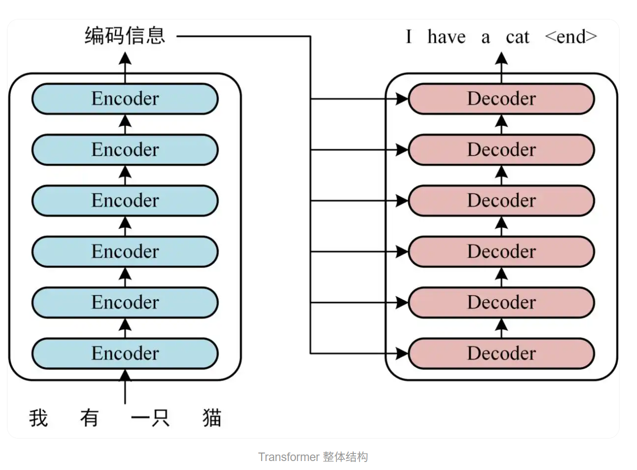 首先介绍 Transformer 的整体结构,下图是 Transformer 用于中英文翻译的整体结构: