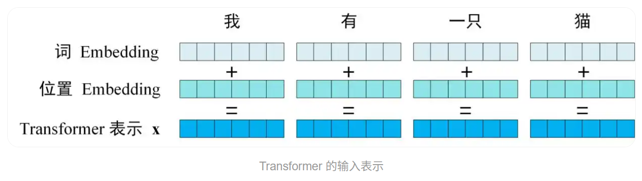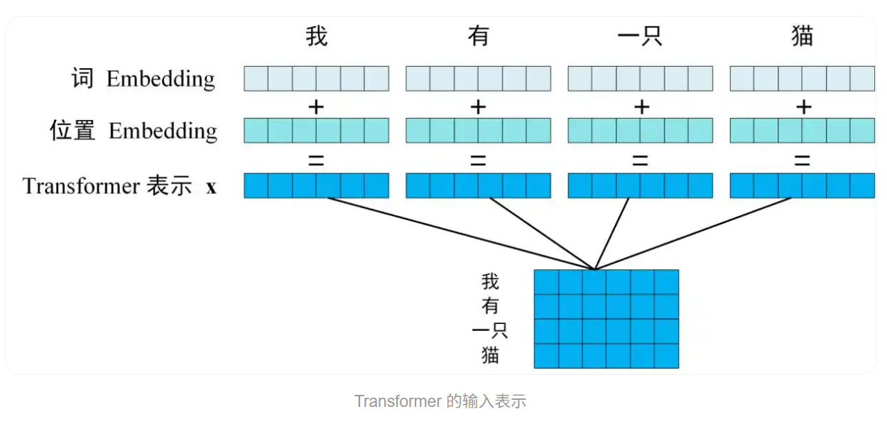 将单词的词 Embedding 和位置 Embedding 相加,就可以得到单词的表示向量 x,x 就是 Transformer 的输入。