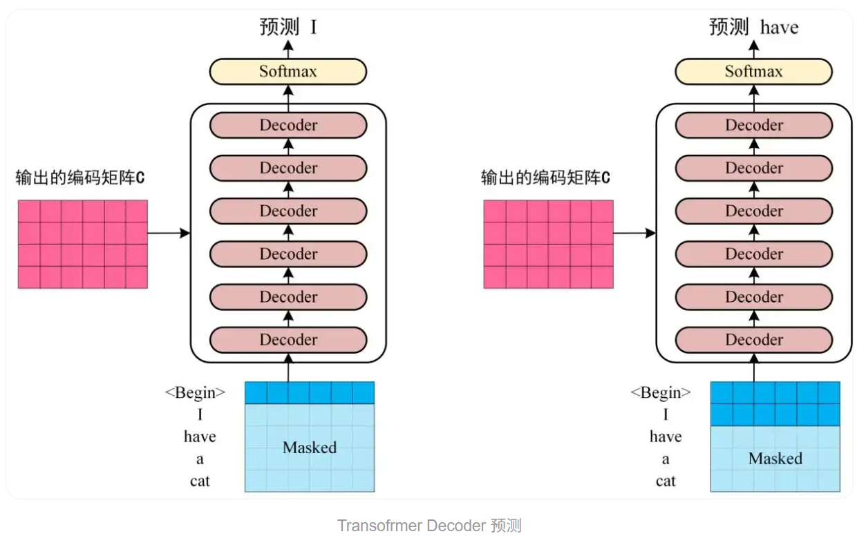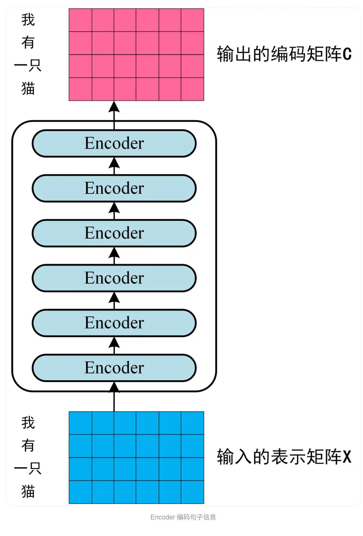 第一个 Encoder block 的输入为句子单词的表示向量矩阵,后续 Encoder block 的输入是前一个 Encoder block 的输出,最后一个 Encoder block 输出的矩阵就是编码信息矩阵 C,这一矩阵后续会用到 Decoder 中。