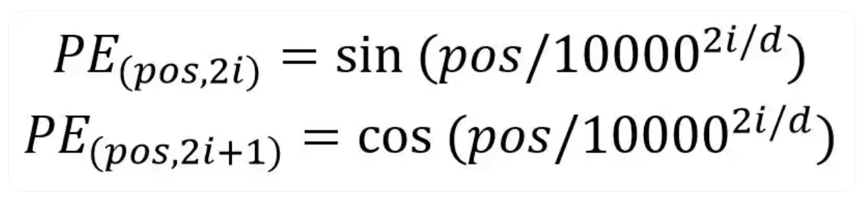 位置 Embedding 用 PE表示,PE 的维度与单词 Embedding 是一样的。PE 可以通过训练得到,也可以使用某种公式计算得到。在 Transformer 中采用了后者,计算公式如下:
