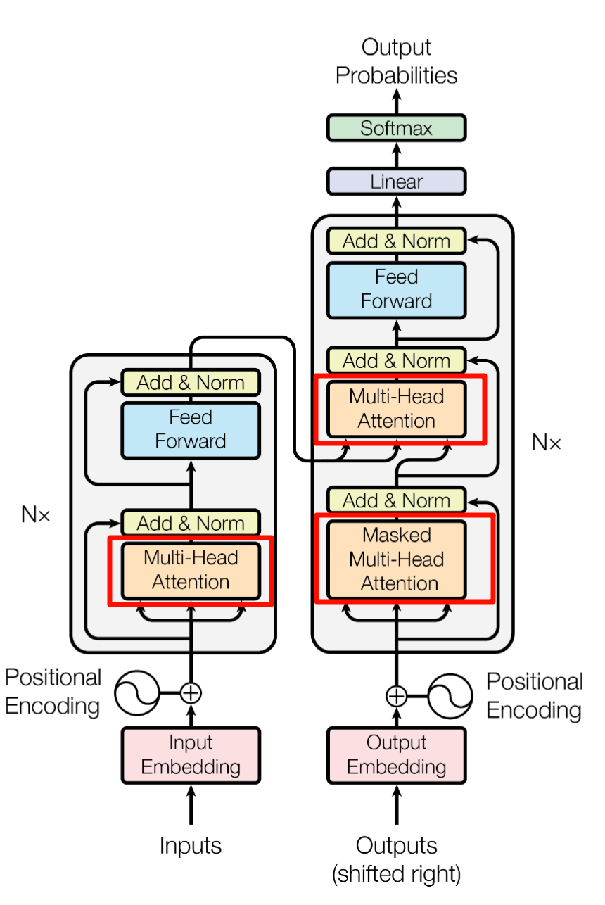 上图是论文中 Transformer 的内部结构图,左侧为 Encoder block,右侧为 Decoder block。红色圈中的部分为 Multi-Head Attention,是由多个 Self-Attention组成的,可以看到 Encoder block 包含一个 Multi-Head Attention,而 Decoder block 包含两个 Multi-Head Attention (其中有一个用到 Masked)。Multi-Head Attention 上方还包括一个 Add & Norm 层,Add 表示残差连接 (Residual Connection) 用于防止网络退化,Norm 表示 Layer Normalization,用于对每一层的激活值进行归一化。
