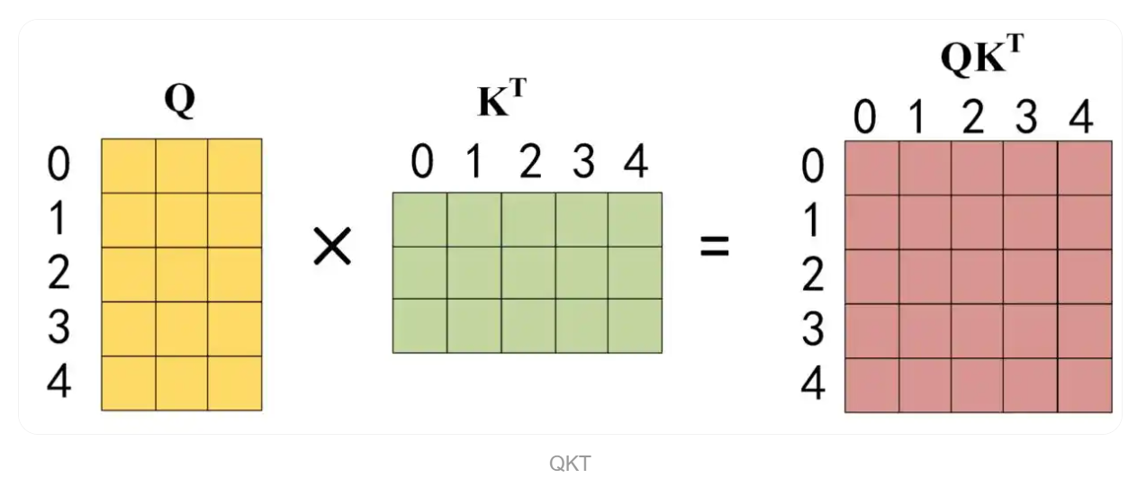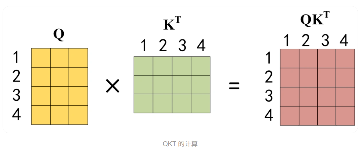 公式中计算矩阵Q和K每一行向量的内积,为了防止内积过大,因此除以 $d_{k}$ 的平方根。Q乘以K的转置后,得到的矩阵行列数都为 n,n 为句子单词数,这个矩阵可以表示单词之间的 attention 强度。下图为Q乘以 $K^{T}$ ,1234 表示的是句子中的单词。