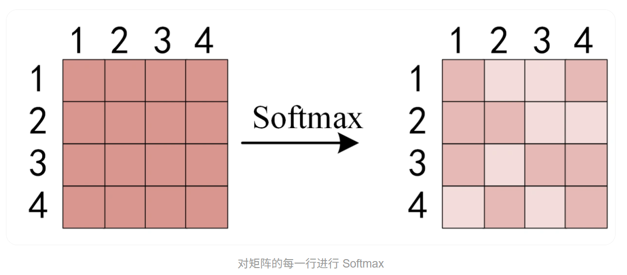 得到$QK^{T}$ 之后,使用 Softmax 计算每一个单词对于其他单词的 attention 系数,公式中的 Softmax 是对矩阵的每一行进行 Softmax,即每一行的和都变为 1.