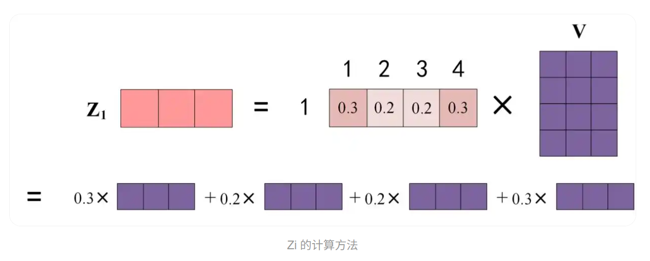 上图中 Softmax 矩阵的第 1 行表示单词 1 与其他所有单词的 attention 系数,最终单词 1 的输出 $Z_{1}$ 等于所有单词 i 的值 $V_{i}$ 根据 attention 系数的比例加在一起得到,如下图所示: