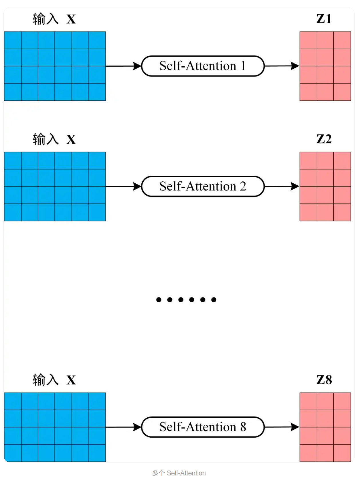 从上图可以看到 Multi-Head Attention 包含多个 Self-Attention 层,首先将输入X分别传递到 h 个不同的 Self-Attention 中,计算得到 h 个输出矩阵Z。下图是 h=8 时候的情况,此时会得到 8 个输出矩阵Z。
