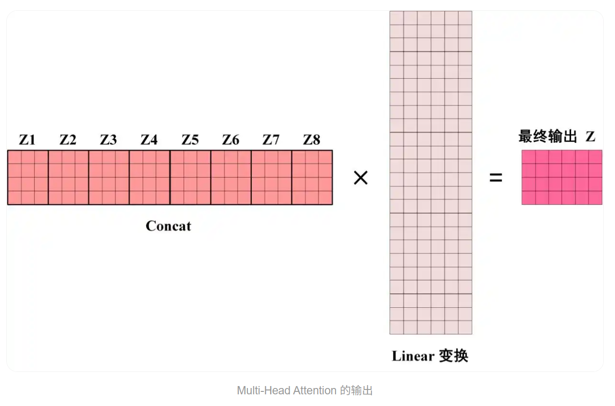 得到 8 个输出矩阵 $Z_{1}$ 到 $Z_{8}$ 之后,Multi-Head Attention 将它们拼接在一起 (Concat),然后传入一个Linear层,得到 Multi-Head Attention 最终的输出Z。