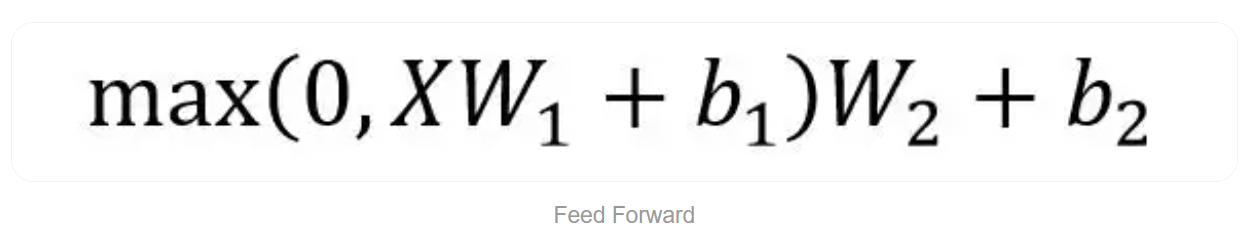 Feed Forward 层比较简单,是一个两层的全连接层,第一层的激活函数为 Relu,第二层不使用激活函数,对应的公式如下。