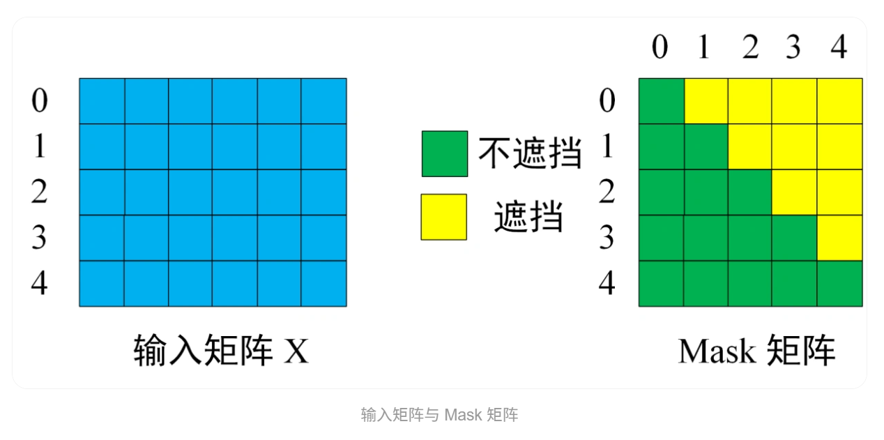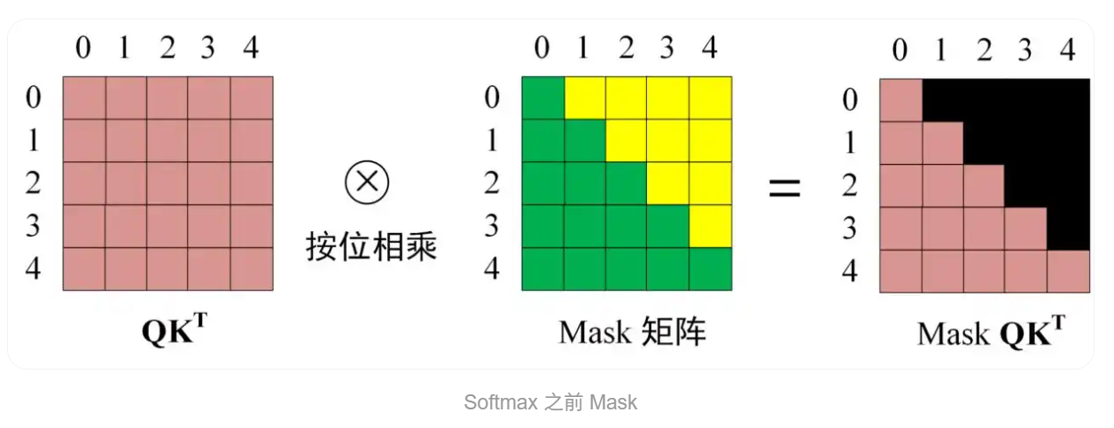 第三步:在得到 $QK^{T}$ 之后需要进行 Softmax,计算 attention score,我们在 Softmax 之前需要使用Mask矩阵遮挡住每一个单词之后的信息,遮挡操作如下:
