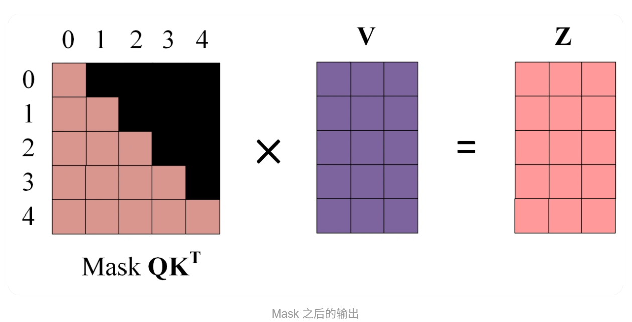 第四步:使用 Mask $QK^{T}$与矩阵 V相乘,得到输出 Z,则单词 1 的输出向量 $Z_{1}$ 是只包含单词 1 信息的。