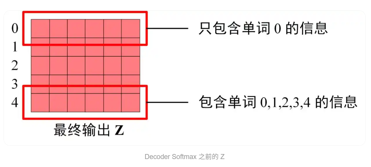 Decoder block 最后的部分是利用 Softmax 预测下一个单词,在之前的网络层我们可以得到一个最终的输出 Z,因为 Mask 的存在,使得单词 0 的输出 Z0 只包含单词 0 的信息,如下: