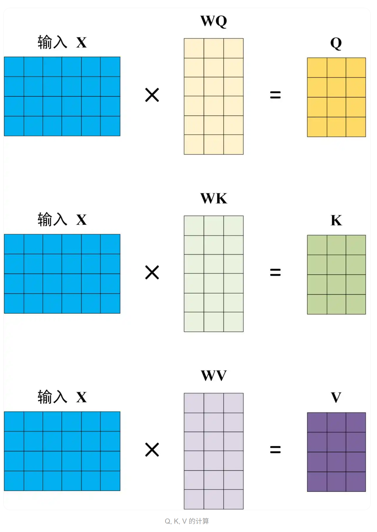 Self-Attention 的输入用矩阵X进行表示,则可以使用线性变阵矩阵WQ,WK,WV计算得到Q,K,V。计算如下图所示,注意 X, Q, K, V 的每一行都表示一个单词。