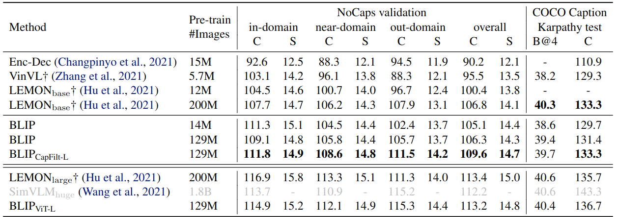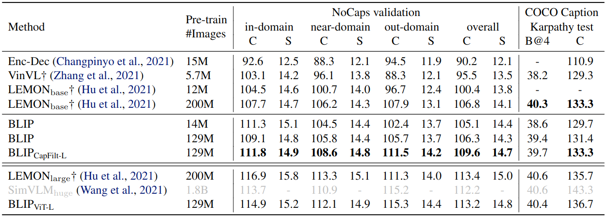 如下图7所示是图片字幕任务实验结果,作者做了两个数据集 NoCaps 和 COCO,两者都使用在 COCO 上微调的模型和 LM 损失进行评估。作者遵循 SimVLM 的做法在每个字幕的开头添加了一个提示 “a picture of”,发现这样使得结果更好了。使用了 14M 预训练图像的 BLIP 大大优于使用相似数量预训练数据的方法。使用了 129M 图像的 BLIP 实现了与使用了 200M 的 LEMON 相比具有竞争力的性能。值得注意的是,LEMON 需要很耗费计算量的预训练的目标检测器和更高分辨率 (800×1333) 的输入图像,导致推理时间比使用低分辨率 (384×384) 输入图像的无检测器 BLIP 慢得多。