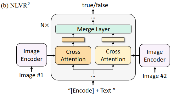 自然语言视觉推理任务要求模型预测一个句子是否描述了一对图像,是个二分类任务。为了能对两对图像进行推理,作者对预训练模型进行了简单的修改,如下图10所示。首先两个图片通过视觉编码器得到视觉特征,再分别通过两个交叉注意力来处理两个输入图片,并且把它们的输出合并起来送入 FFN 中。这两个 Cross-Attention 层是从相同的预训练权重初始化的。通过 [Encode] token 的过了 MLP 的输出完成二分类任务。