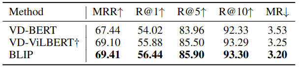 实验结果如下图13所示,BLIP 在 VisDial v1.0 验证集上实现了最先进的性能。