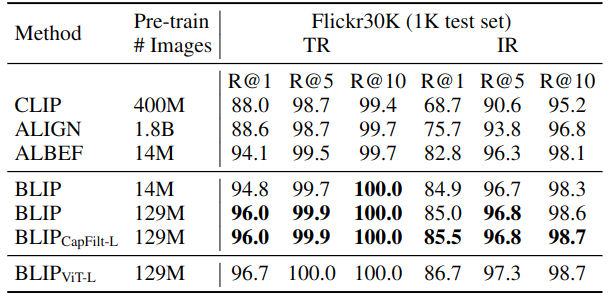 BLIP 这种新的 VLP 框架可以灵活地在视觉理解任务上和生成任务上面迁移,这是针对第一个问题的贡献。至于第二个问题,BLIP 提出了一种高效率利用噪声网络数据的方法。即先使用嘈杂数据训练一遍 BLIP,再使用 BLIP 的生成功能生成一系列通过预训练的 Captioner 生成一系列的字幕,再把这些生成的字幕通过预训练的 Filter 过滤一遍,得到干净的数据。最后再使用干净的数据训练一遍 BLIP。