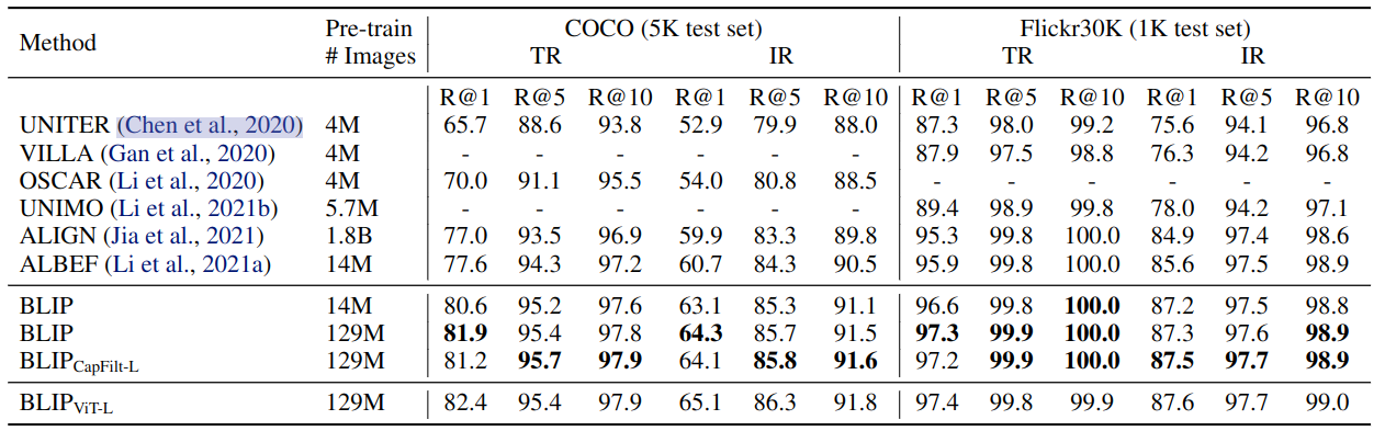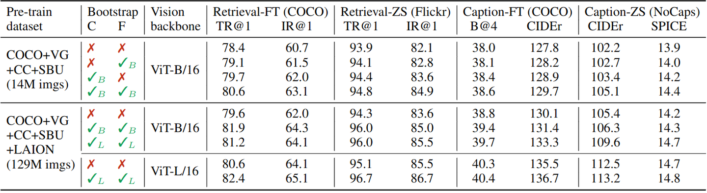 当使用更大的数据集 129M 的设置或者更大的模型 ViT-L 时,CapFilt 可以进一步提高性能,这验证了它在数据大小和模型大小方面的可扩展性。而且,仅仅增加字幕器和过滤器的模型尺寸时,也可以提高性能。
