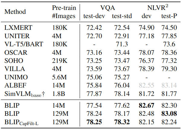 实验结果如下图11所示,BLIP 优于所有现有方法,除了 ALBEF 执行定制预训练的额外步骤。但是有趣的是,NLVR2 的性能并没有从额外的网络图像中受益太多,这可能是由于网络数据和下游数据之间的域差距。