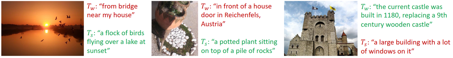 高质量的人工注释图像-文本对 $\left{ (I_h, T_h) \right}$ (例如,COCO) 因为成本高昂所以数量不多。最近的工作 ALBEF,SimVLM 利用从网络自动收集的大量替代的图文对 $\left{ (I_w, T_w) \right}$ 。但是,这些网络的替代数据集通常不会准确地描述图像的视觉内容,质量相对嘈杂,带噪声的监督信号肯定不是最优的。