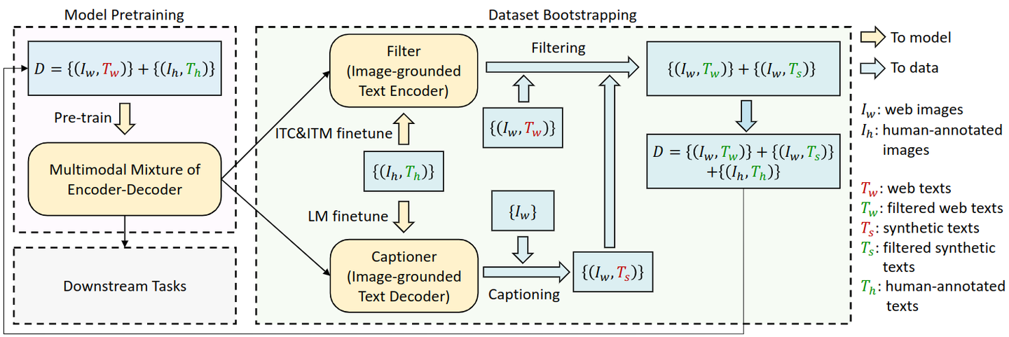 **过滤器 Filter:**过滤掉噪声图文对。它是一个视觉文本编码器,看文本是否与图像匹配,在 COCO 数据集上使用 ITC 和 ITM 目标函数微调。Filter 删除原始 Web 文本 $T_w$ 和合成文本 $T_s$ 中的嘈杂文本,如果 ITM 头将其预测为与图像不匹配,则认为文本有噪声。
