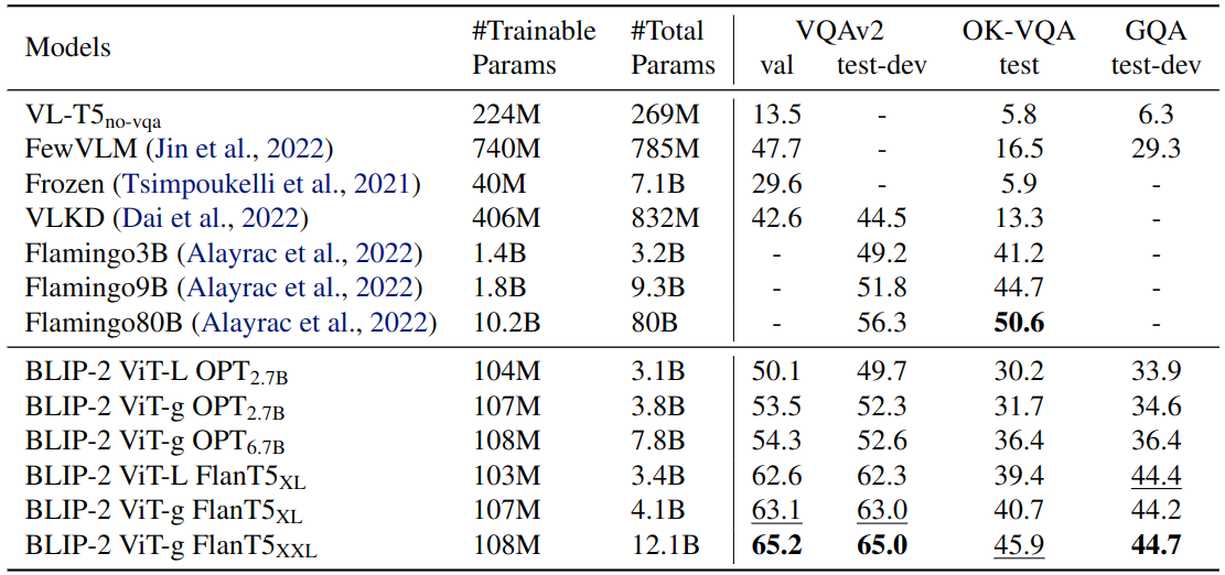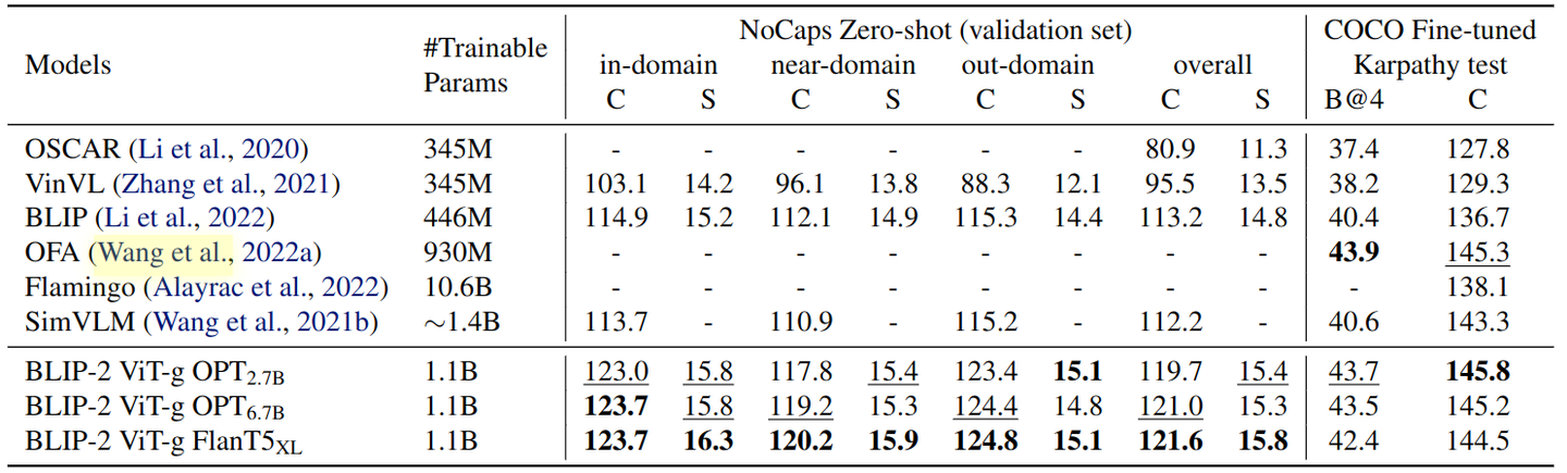 下图6概述了 BLIP-2 在各种 Zero-Shot 视觉语言任务上的性能。与之前最先进的模型相比,BLIP-2 在视觉语言预训练期间实现了更好的性能,同时需要更少的可训练参数数量。