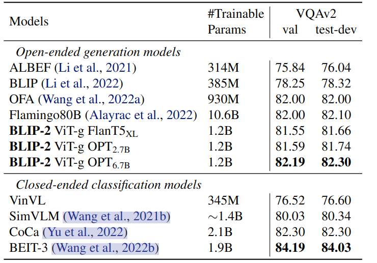 实验结果如下图11所示,BLIP-2 属于开放式生成模型,并取得了最佳的性能。