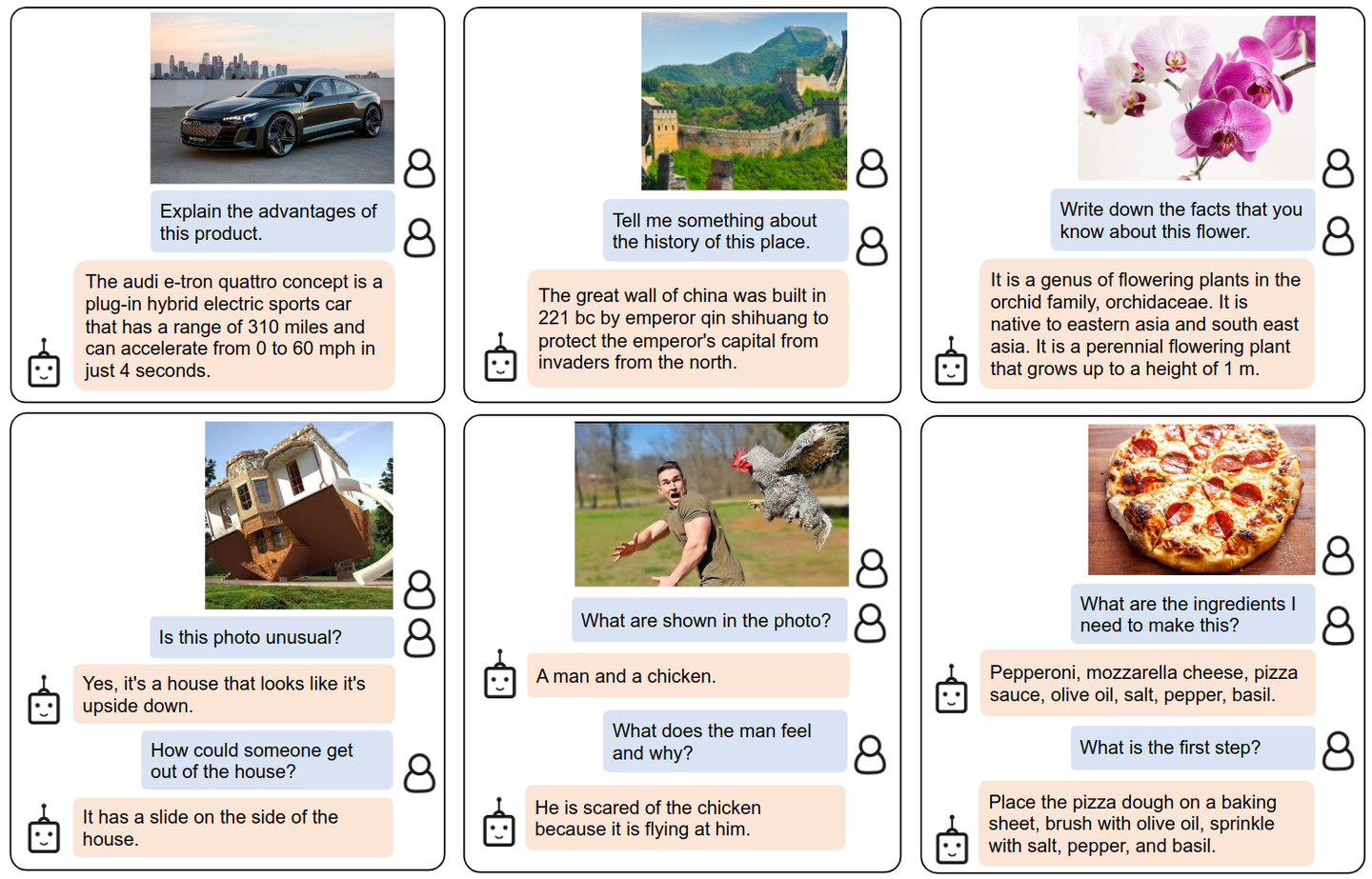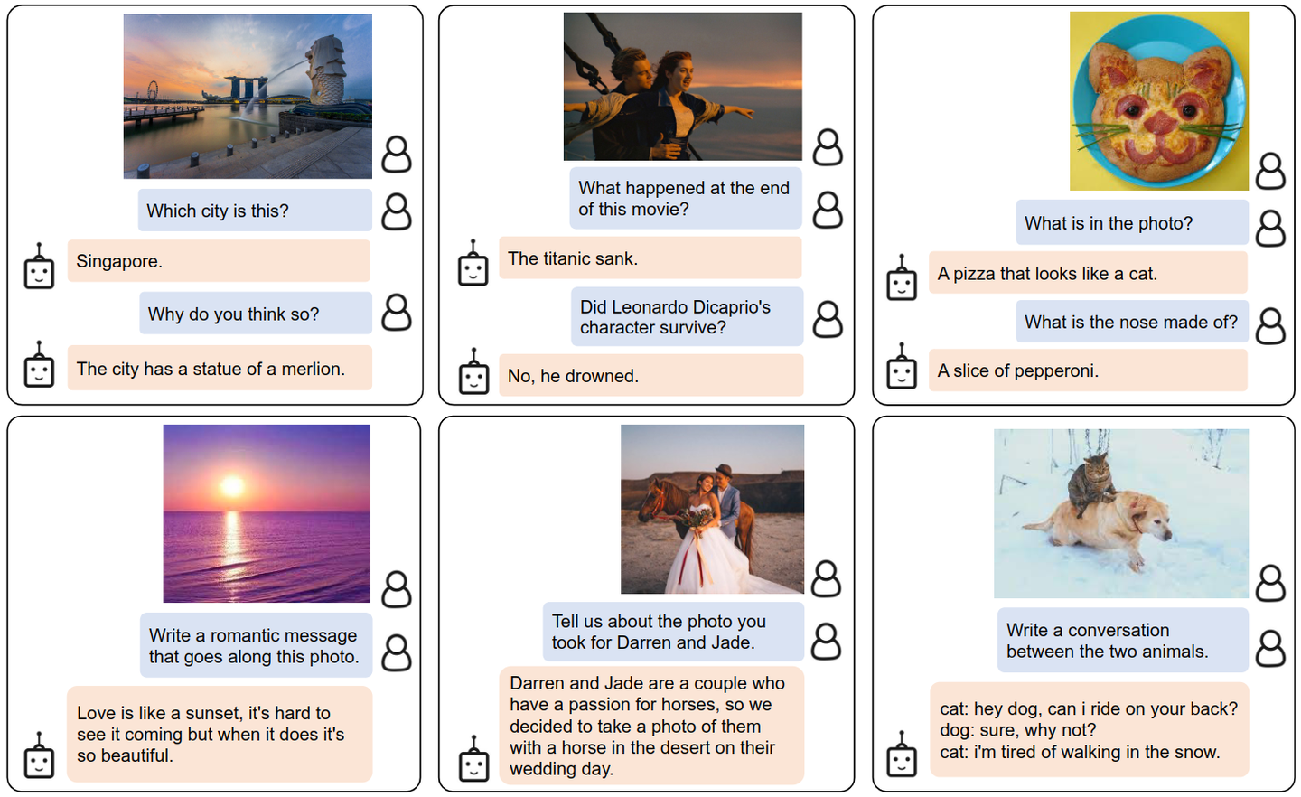 先来看几张 Zero-shot 指令控制图文生成任务的实验结果,包括视觉知识推理、视觉常识推理、视觉对话、个性化图像到文本生成如下图4和5所示。只需在视觉提示之后附加文本提示作为 LLM 的输入。