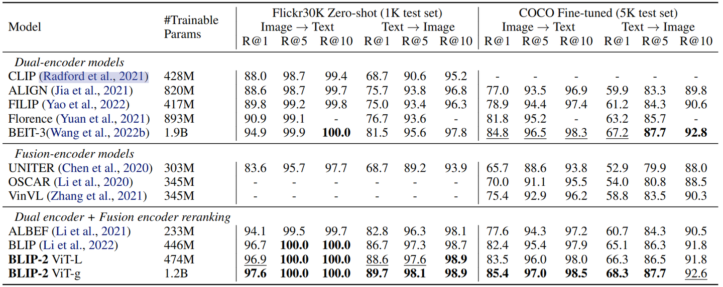 图像文本检索不涉及语言生成,所以作者直接微调第1阶段预训练模型。作者使用与预训练相同的目标函数,即 ITC、ITM 和 ITG。数据集使用 COCO,微调 Q-Former 和图像编码器。评测数据使用 COCO 和 Flickr30K,任务是 image-to-text retrieval 和 text-to-image retrieval。实验结果如图12所示,BLIP-2 在 Zero-Shot 的图像文本检索方面实现了最先进的性能,与现有方法相比有了显着改进。