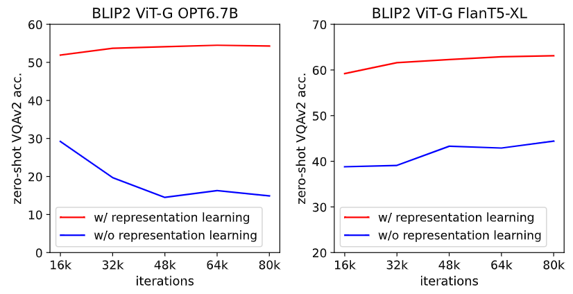 BLIP-2 第一阶段的表征学习预训练 Q-Former 来学习与文本相关的视觉特征,这减少了 LLM 学习视觉语言的负担。如下图8所示是第一阶段的表征学习对生成学习的影响。在没有表征学习的情况下,这两种类型的 LLM 在 Zero-Shot VQA 上的性能都要低得多。而且,OPT 会有灾难性遗忘的问题,即随着训练的进行,性能会急剧下降。