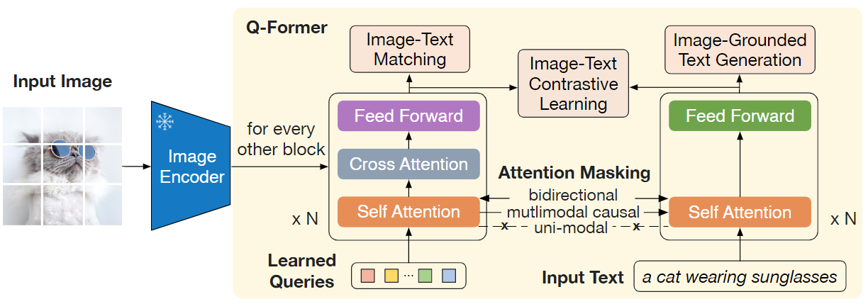 BLIP-2 由预训练好的,冻结参数的视觉模型和文本模型,外加所提出的可训练的 Q-Former 构成。固定的图像编码器从输入图片中提取视觉特征,Q-Former 架构是由2个 Transformer 子模块构成,其中注意 Self-Attention 是共享的,可以理解为 Self-Attention 的输入有2个,即:Queries 和 Text。