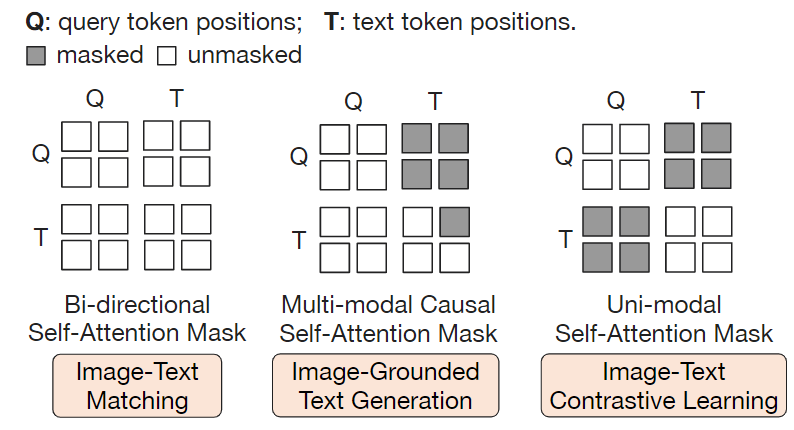 训练的目标函数,作者遵循 BLIP 的做法,联合优化3个具有相同输入格式和模型参数的预训练目标,每个目标函数使用不同的 mask Attention 来控制注意力的交互。