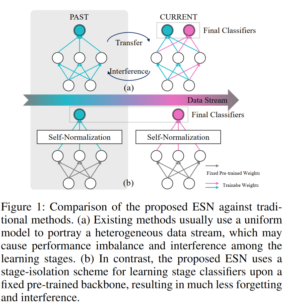 先前的增量学习方法需要在稳定性和可塑性之间找到一个脆弱的平衡。使用统一模型来描述异构数据流可能导致零和博弈,并且会严重偏向新类别(De Lange et al. 2021; Mai et al. 2022)。