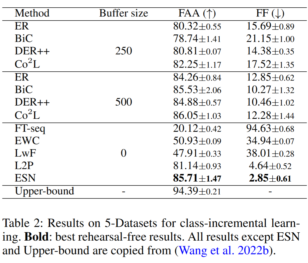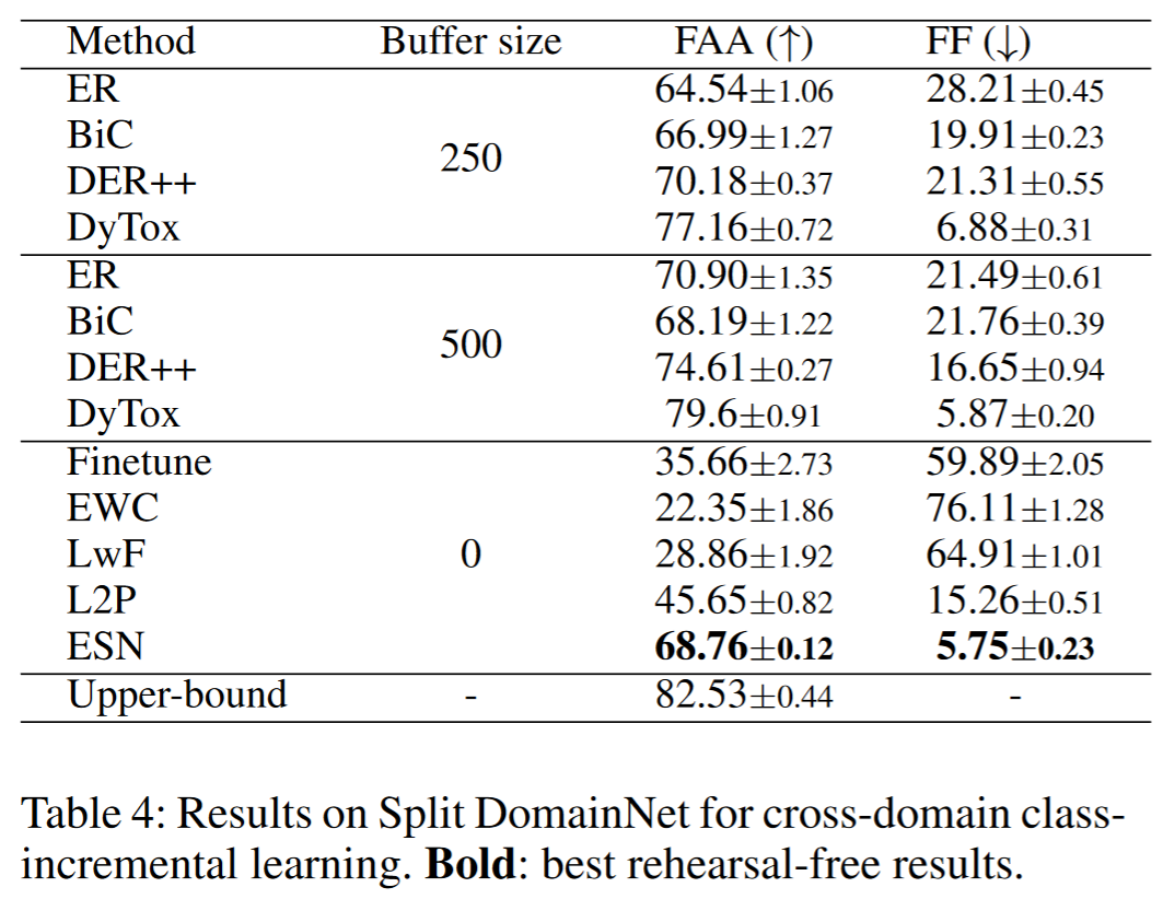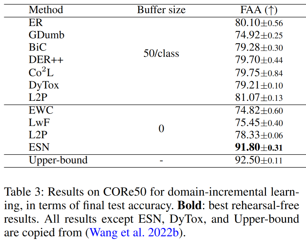 表 3 总结了在 CORe50 基准上的结果。CORe50 是一个具有挑战性的 DIL 基准,它使用 8 个领域作为训练集,3 个领域作为测试集。这意味着测试图像不属于任何训练领域,该基准主要测试增量学习后的泛化能力。ESN 在使用相同的 ViT-B/16 预训练骨干的情况下,相比其他方法取得了最佳性能(相比 L2P 提高了约 17%)。由于测试图像没有正确的阶段 ID(没有领域重叠),ESN 的准确率来自于集成投票策略。