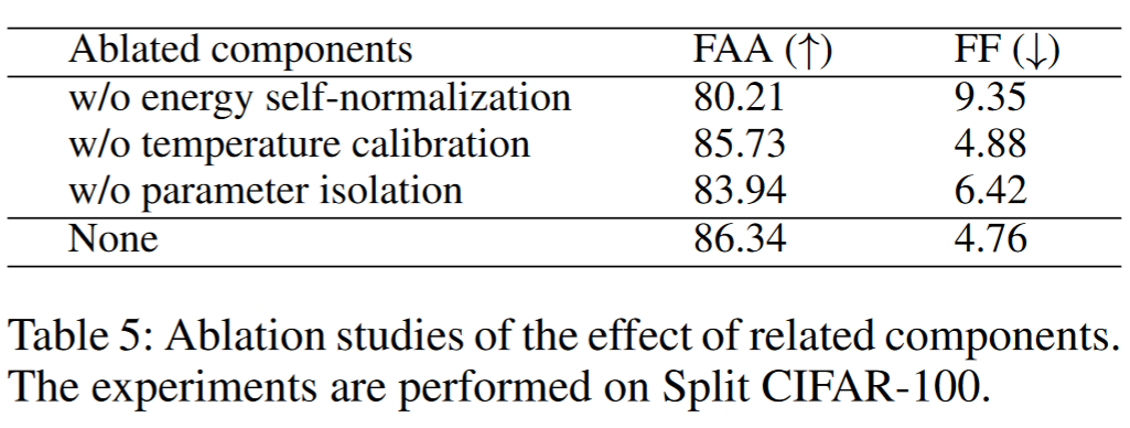 为了进一步研究 ESN 的有效性,我们研究了主要组件的影响。表 5(第 1 行)移除了所提出的基于锚点的能量自归一化策略 $L_s^{\text{al}}$,并保持其他部分不变。性能显著下降,这表明将所有隔离分类器对齐到相同的能量平面是公正聚合它们以进行最终预测的关键。表 5(第 2 行)移除了我们提出的温度选择策略,仅使用默认温度 1 进行预测,而不进行投票。结果略低于 ESN。这种下降表明,使用所提出的温度校准可以进一步提升性能。表 5(第 3 行)在任务之间共享相同的类注意力块(CAB)。结果显示,参数隔离在处理灾难性遗忘和保持性能方面非常重要。