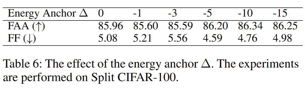$\Delta$ 是我们提出的能量自归一化损失的主要超参数,我们进行了消融研究以调查其影响。表 6 显示了最终结果(FAA 和 FF)对 $\Delta$ 的值不敏感。这可能是因为最重要的是将所有分类器归一化到相同的能量平面。