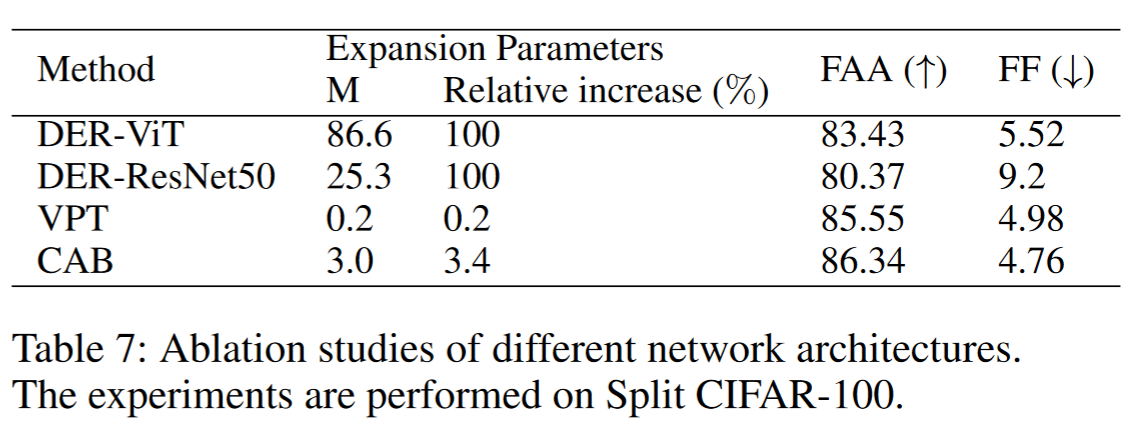 在主要实验中,我们主要将类注意力块作为解码器附加到预训练的骨干上。我们指出,其他网络架构也可以使用我们提出的能量自归一化方法。表 7 总结了使用不同架构的结果。在这里,我们添加了两个参数隔离方法以展示我们的想法:VPT(Jia et al. 2022)和 DER(Yan, Xie, and He 2021)。VPT 在输入中添加少量任务特定的可学习参数,同时冻结模型的其他部分,以将预训练模型微调到下游任务。DER 为每个新任务扩展一个新的网络。网络可以是任何类型,我们使用 ResNet50 和 ViT-B/16 进行实验。我们在表 7 中报告了单个增量阶段的扩展参数量。尽管 VPT 的扩展参数量显著少于 CAB,但 VPT 的推理时间几乎是 CAB 的十倍。这是因为 CAB 作为特定阶段的解码器,并使用共享的骨干提取图像特征,从而减少了计算开销。类似 DER 的方法存在相同的推理速度问题,并且表现不如 VPT 和 CAB。类似 DER 的方法表现较差的原因可能是在数据集的较小子集上训练大型模型会导致严重的过拟合。
